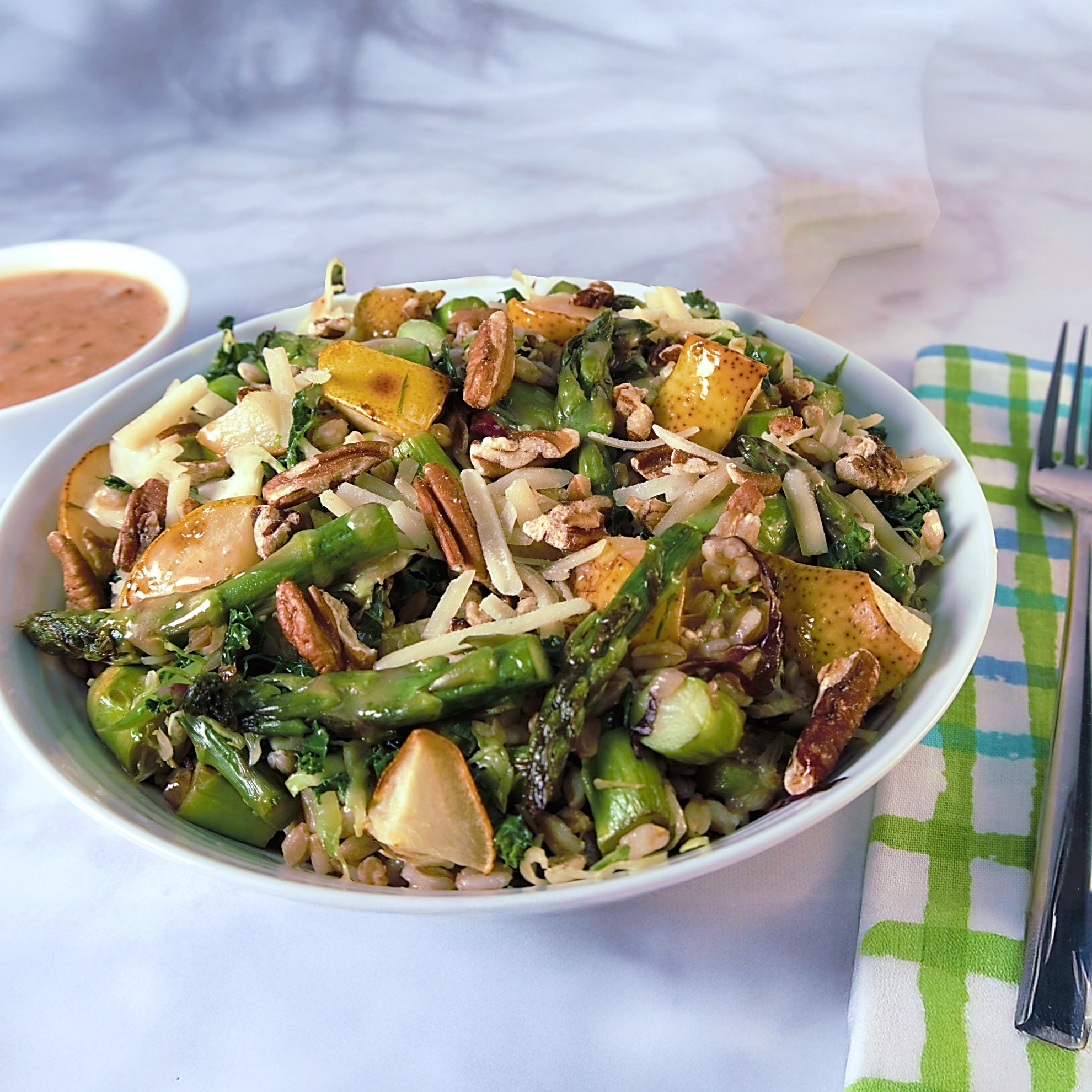 Farro With Sautéed Asparagus & Roasted Pear (Veg) OR ADD Chicken, Salmon or Shrimp