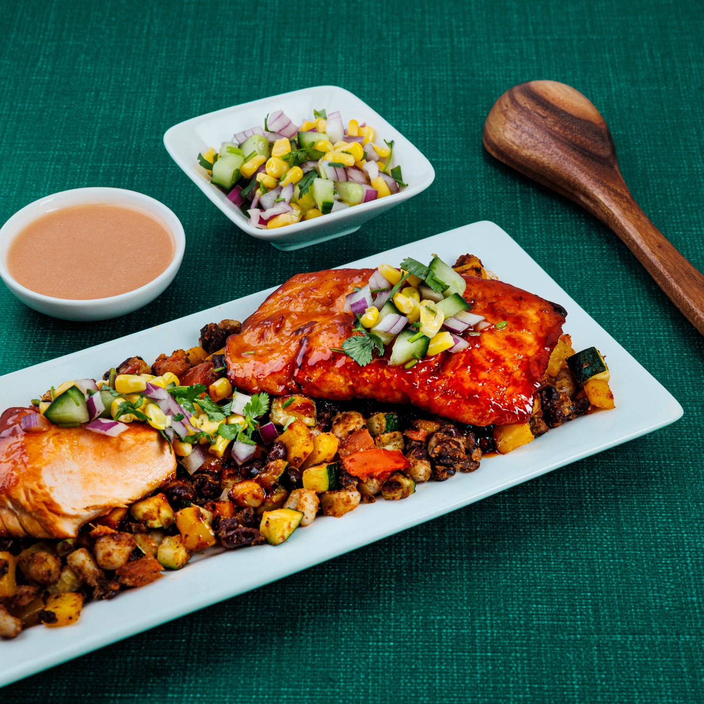 We challenged the test kitchen for a low-calorie, high-flavor weeknight dinner, and they hit it out of the ballpark with this glazed salmon recipe. Ready in just 15 minutes, the salmon is full of flavor thanks to a chipotle glaze and peach coulis. Paired with black beans, hominy, zucchini and corn salsa, it’s fresh and delicious.