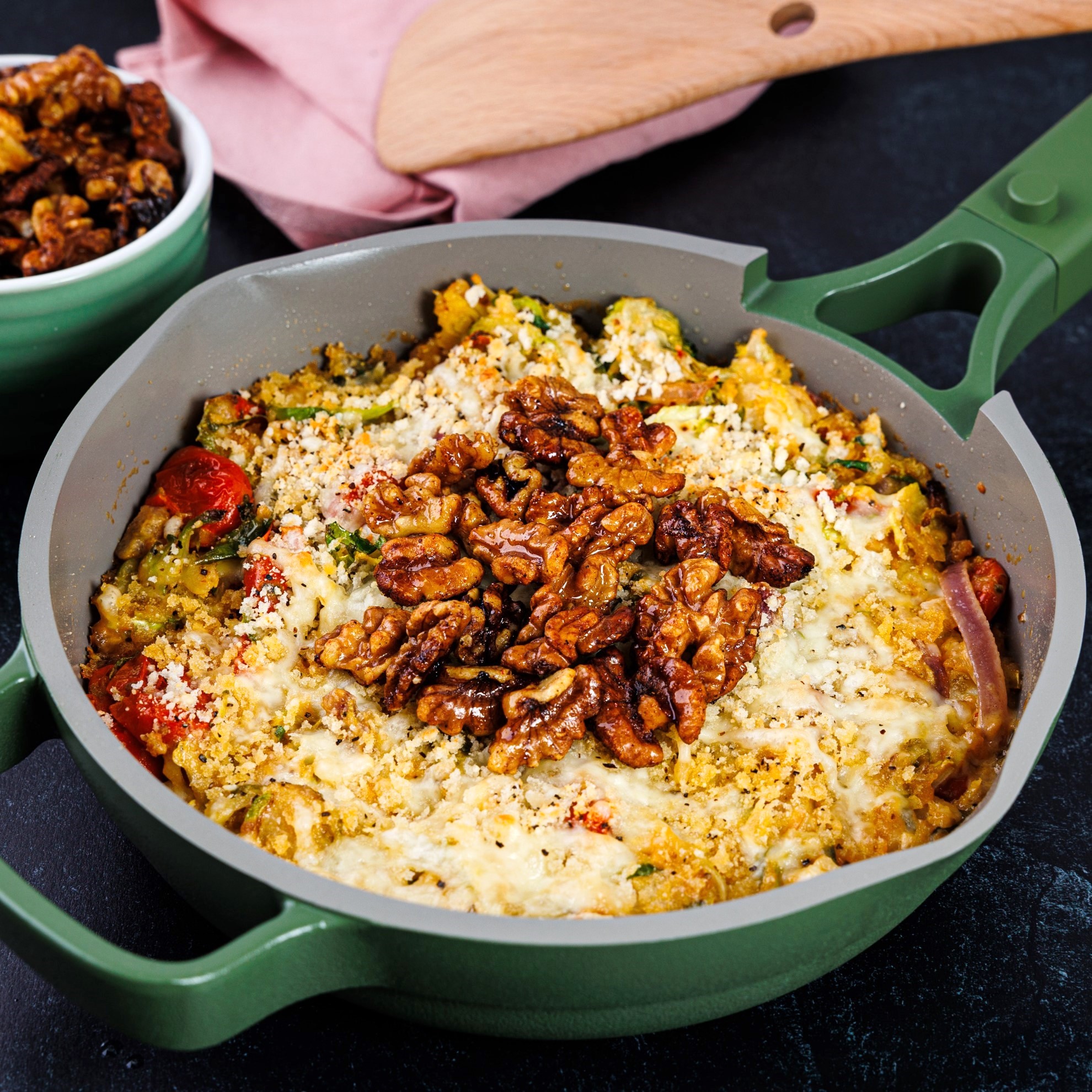 There are few dinners more delicious than a cozy gratin this time of the year. We’re making this one with brussels sprouts, cauliflower and crushed tomatoes and a creamy four-cheese sauce that’s perfect on a chilly night. It's topped with sweet spiced nuts that add a zing the whole family loves. -- To add chicken, steak, salmon, or shrimp, see "ADD PROTEIN” section below entrees. --