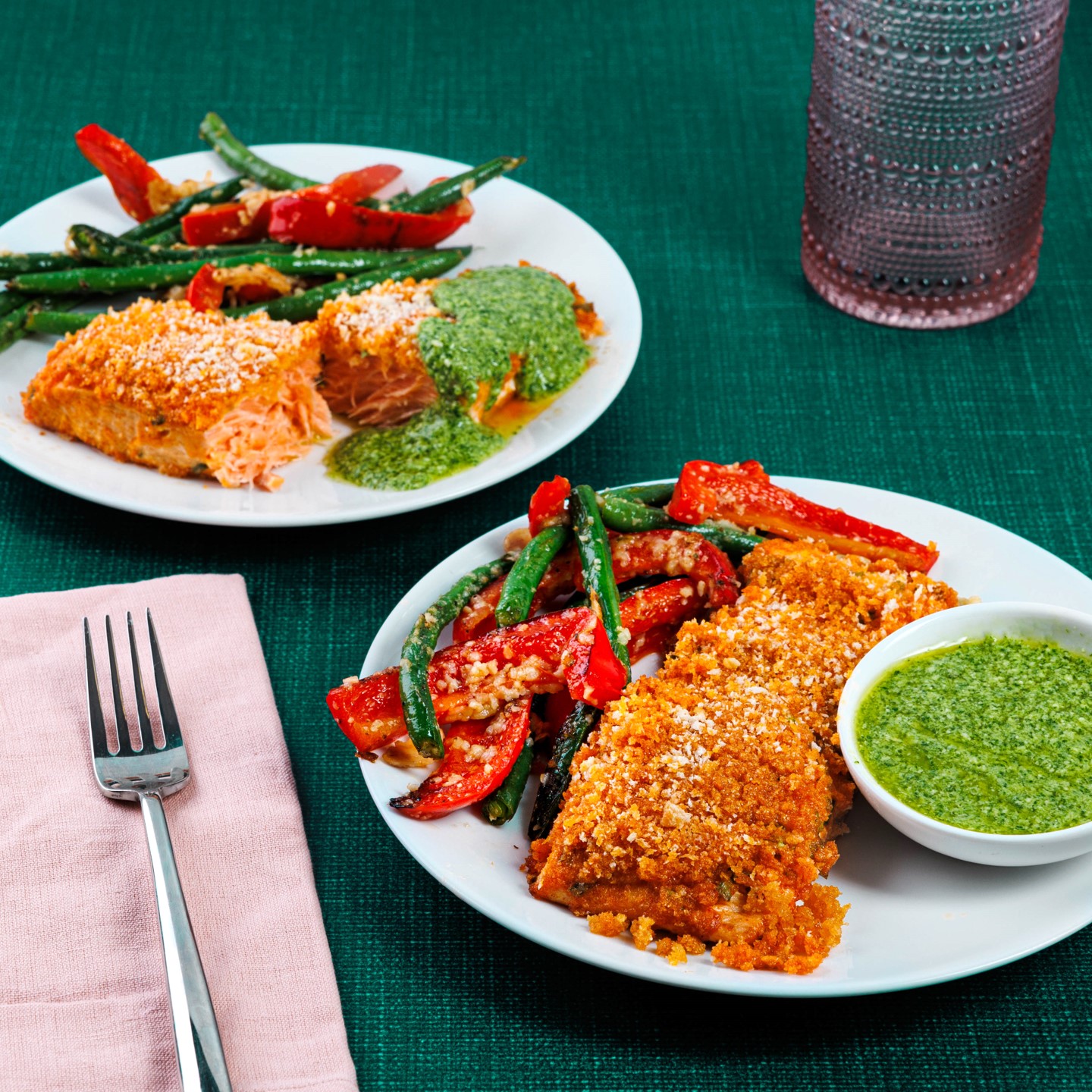 Great ingredients lead to a fancy dinner but without a lot of fuss. We’re baking salmon with a paprika and panko crust and Arugula Pesto sauce for loads of flavor, then serving it alongside sautéed peppers and green beans tossed with grated Parmesan. It’s simple, satisfying, and oh-so delicious.