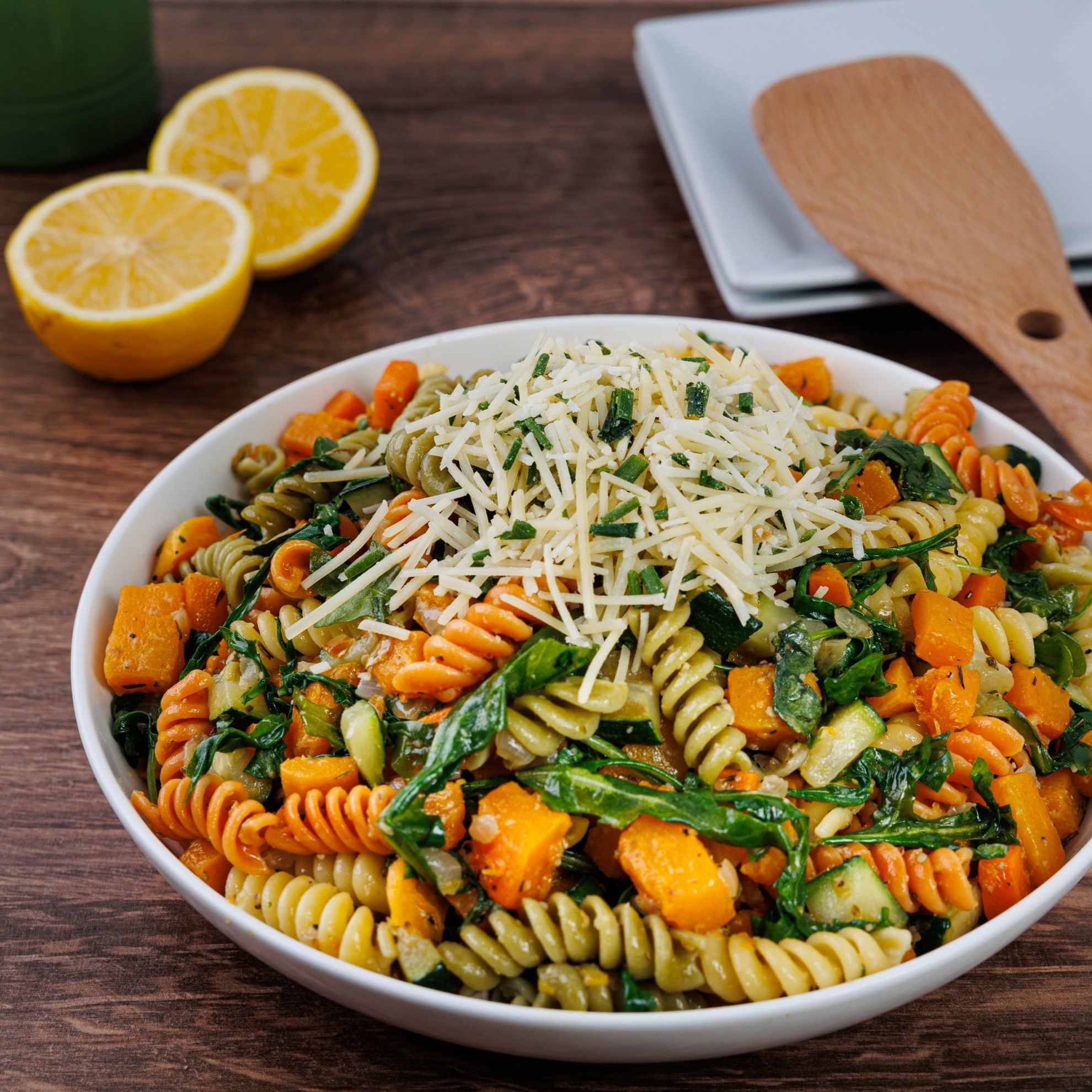 We challenged the test kitchen for an evolution of winter comfort food, and they produced this gem. Cozy roasted and caramelized butternut squash and tricolor rotini make it cozy, and arugula and chives keep it light. Topped with Parmesan, it’s flat out delicious. - -- To add chicken, steak, salmon, or shrimp, see "ADD PROTEIN” section below entrees. --