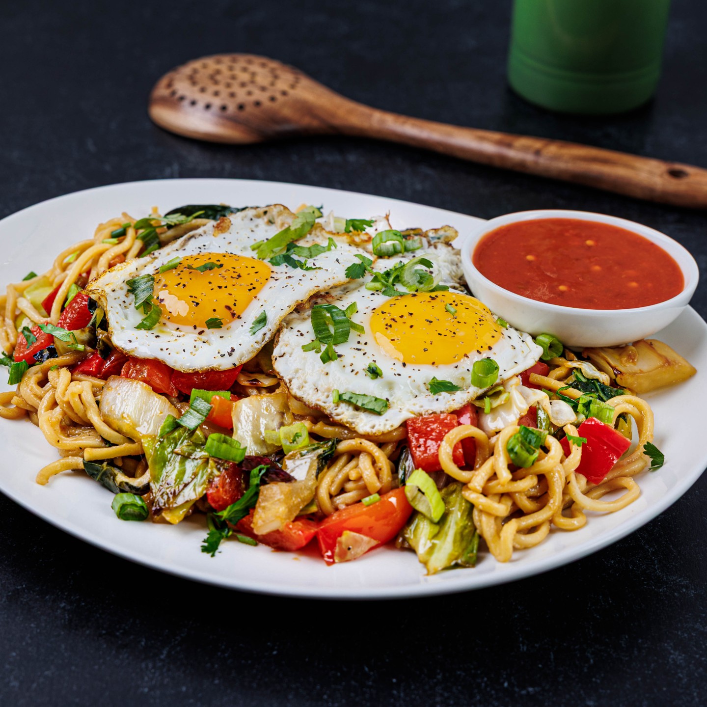 Inspired by Singapore’s street food scene, these noodles are packed with layers of flavor. Charred veggies, yaki soba noodles, and our signature stir-fry sauce come together with sesame sambal and a fried egg on top. It’s spicy, savory, and bursting with freshness in every bite. -- To add chicken, steak, salmon, or shrimp, see "ADD PROTEIN” section below entrees. --