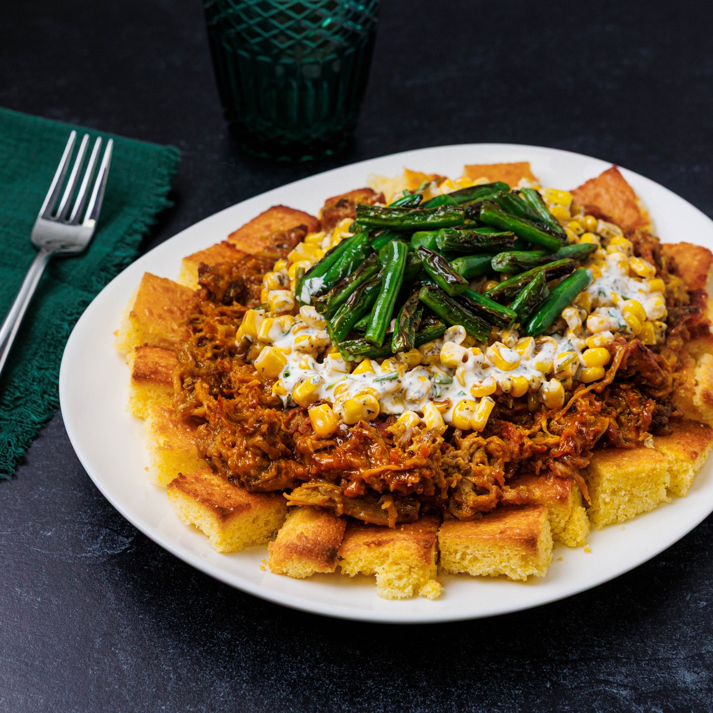 Carolina BBQ is an American classic. We’re cooking up our version this week with pulled pork, seared green beans and toasted cornbread. With a drizzle of buttermilk ranch, it’s a speedy dinner that’s packed with flavor.