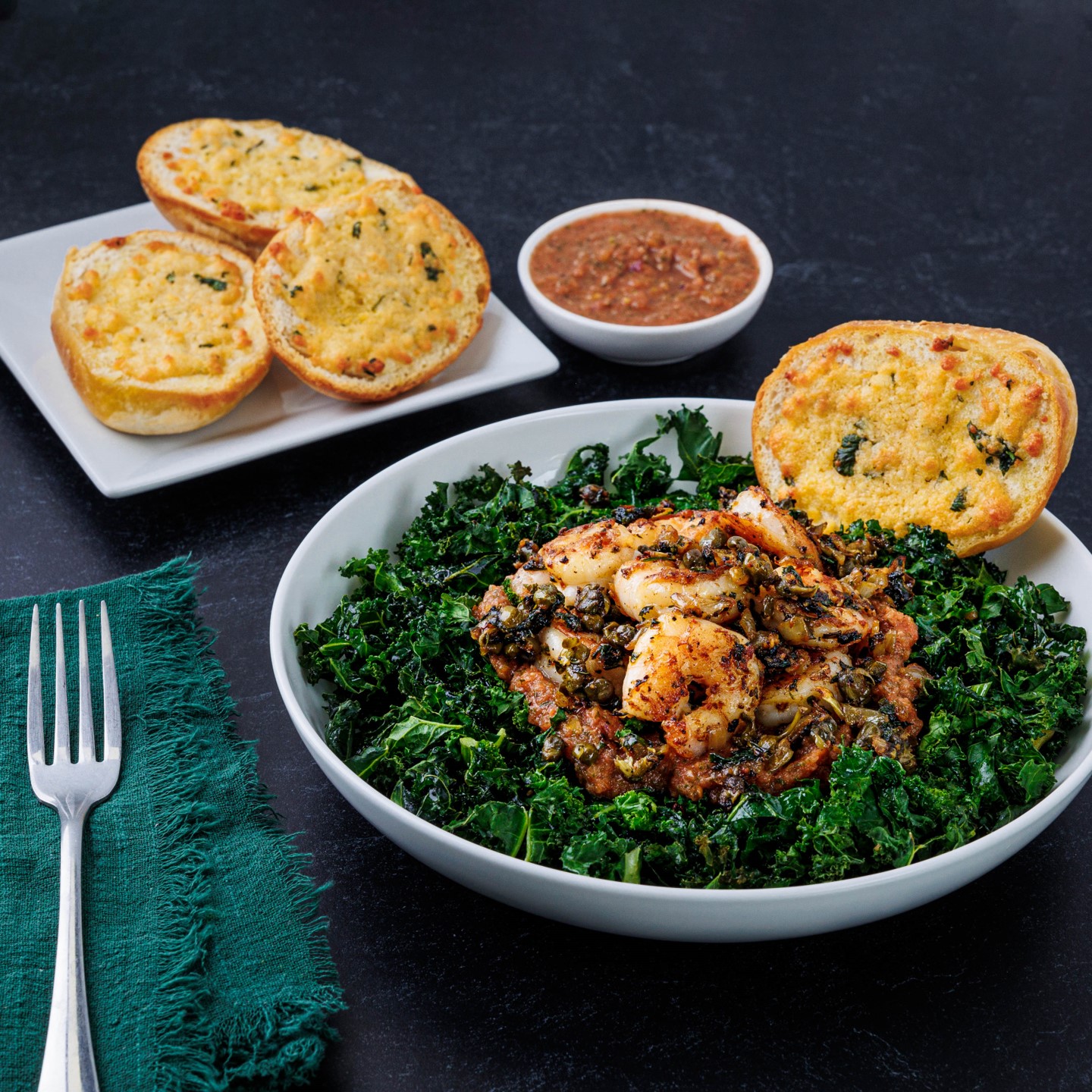 We love to balance indulgence and nutrition in the Meez kitchen, and this recipe checks all the boxes: garlicy buttery piccata sauce, fresh marinara, heart-healthy shrimp and roasted kale. Plus fresh garlic bread because we couldn’t resist.