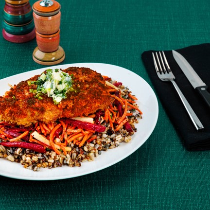 We’re bringing all the flavors of a Chicken Kiev to a busy weeknight by skipping the fussy rolling and stuffing. Panko-crusted chicken breasts, chive butter and a roasted root vegetable pilaf, it’s a perfect cozy dinner.