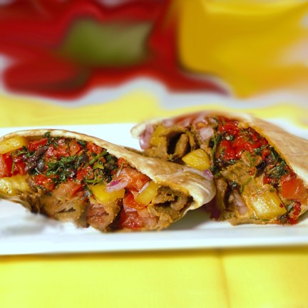 Gyros with pita is the perfect speedy dinner after a long day at work. Add delicious olive & red pepper tapenade, tomatoes, yellow peppers and chickpea romesco sauce and you have a fun and meal that's on the table in just ten minutes.