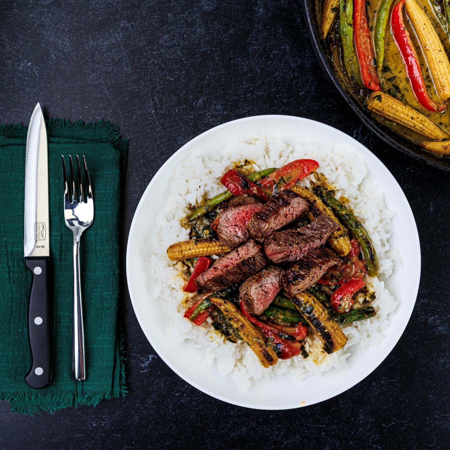 We love a dinner that’s low on fuss and high on flavor, and this one knocks it out of the park. We’re pairing a mellow green curry with seared steak strips, green beans, peppers and baby corn, then serving it over jasmine rice. Super simple, super delicious.