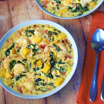 We love a hearty soup on a chilly night, and this recipe is a favorite. With shrimp, corn, butternut squash, bacon and a splash of cream, this recipe is comfort food at its best. (Did we mention it’s on the table in less than 30 minutes?)