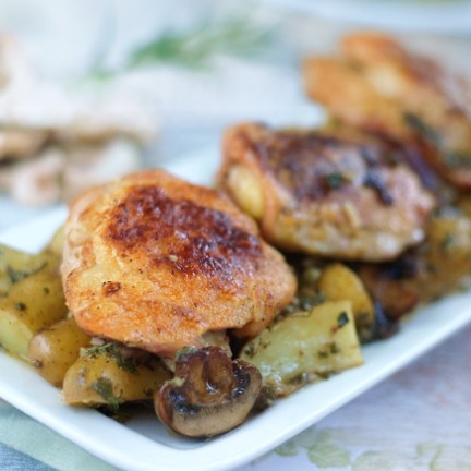 We're putting a fresh spin on the classic roast chicken this week. With roasted fingerling potatoes, cremini mushrooms, a fresh herb rub on tender, juicy dark meat, and hands-free white wine sauce, it's a sophisticated one-pot dinner we just love. (Did we mention it's just 10 minutes hands on?)