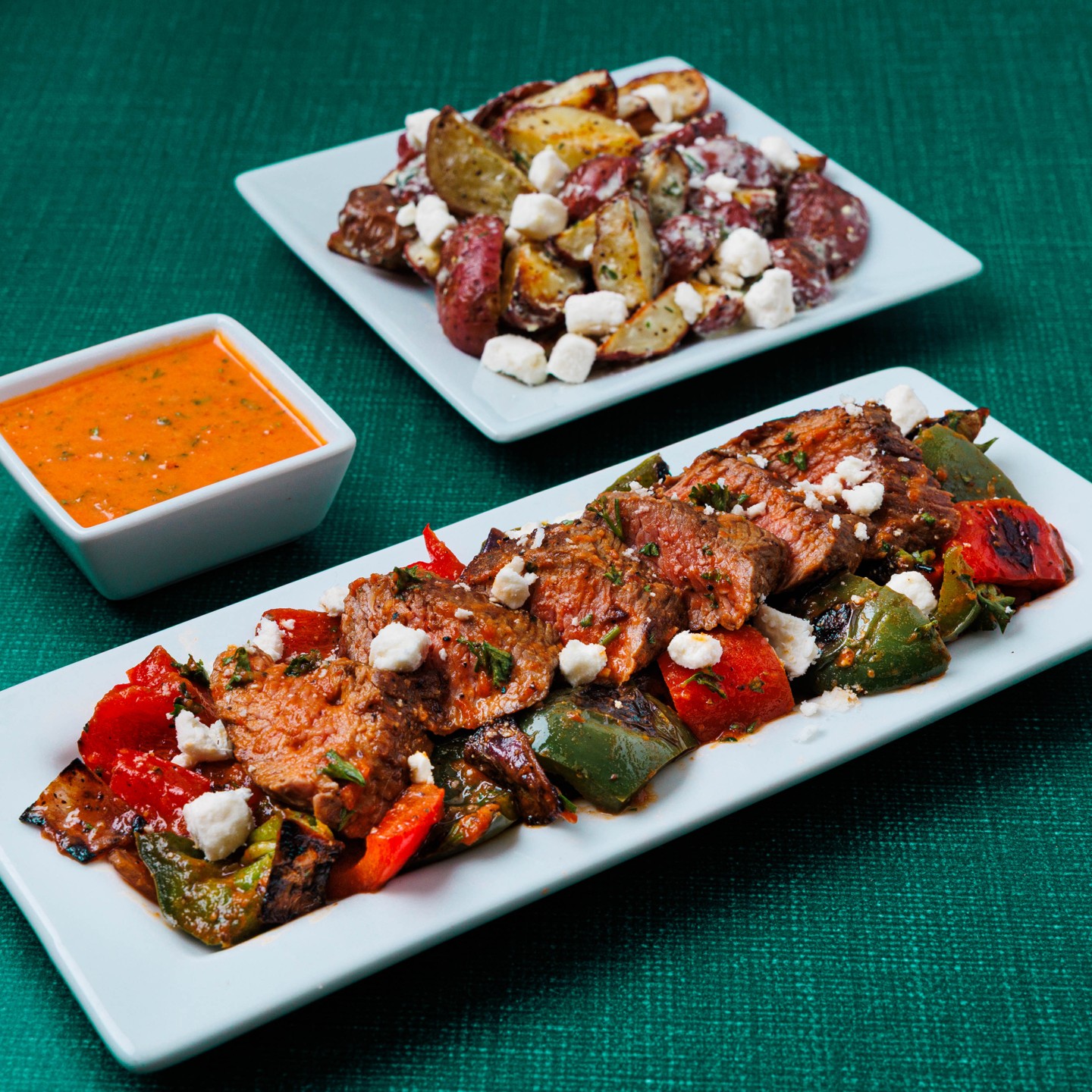Big Mediterranean flavor in every bite. Seared steak and charred peppers are tossed in a creamy roasted red pepper sauce, then served alongside Greek-style potatoes coated in lemony tzatziki. A sprinkle of feta brings it all together for a dinner that’s rich, bright, and full of sunshine.
