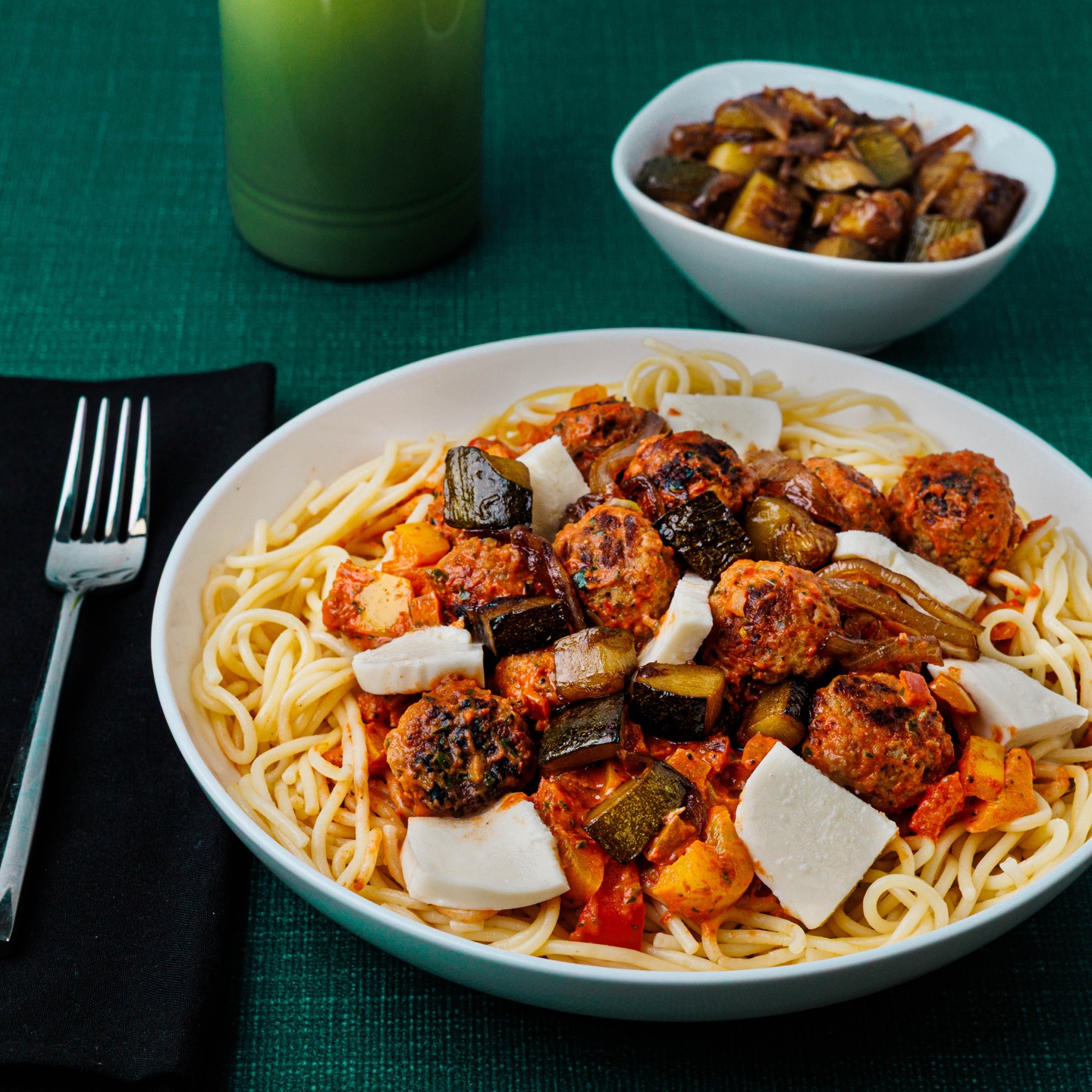 We’re taking classic spaghetti and meatballs somewhere brighter and more refined. A creamy tomato sauce coats the pasta and tender beef meatballs, while fresh mozzarella adds soft, cool bites throughout. Finished with balsamic-glazed vegetables for sweetness and depth, it’s an elevated dinner the whole family can get behind.