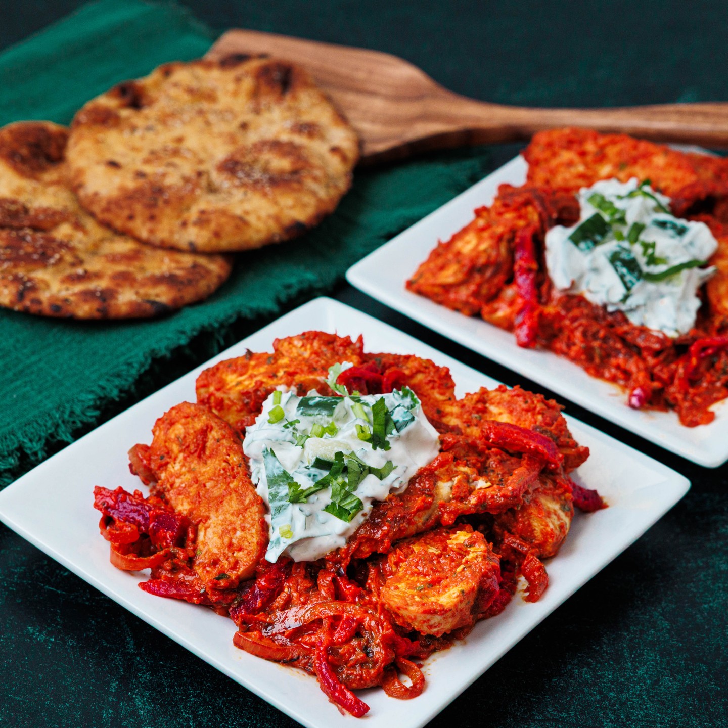 This dinner is all about bold flavor without feeling intimidating. All-natural chicken breast is combined with a Pakistani tomato-cream-sauce spiced with cumin, coriander, turmeric, and fenugreek, giving it deep warmth and richness. Finished with cool cucumber mint crema and served with warm naan for scooping, it’s comforting, flavorful, and ready in just 20 minutes.