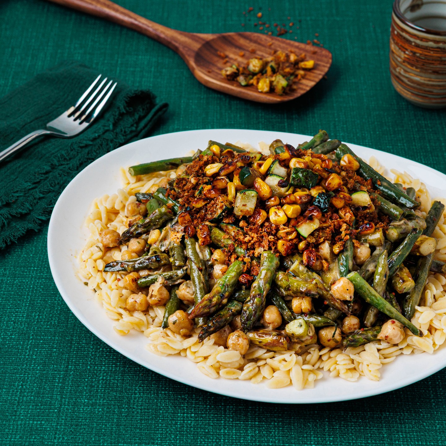 We’re letting vegetables take the spotlight in this vibrant orzo bowl. Asparagus, green beans, and chickpeas are coated in a tangy honey Dijon dressing, then layered over tender pasta. A topping of toasted garlic breadcrumbs with zucchini and sweet corn adds irresistible crunch and depth. -- To add chicken, steak, salmon, or shrimp, see "ADD PROTEIN” section below entrees. --