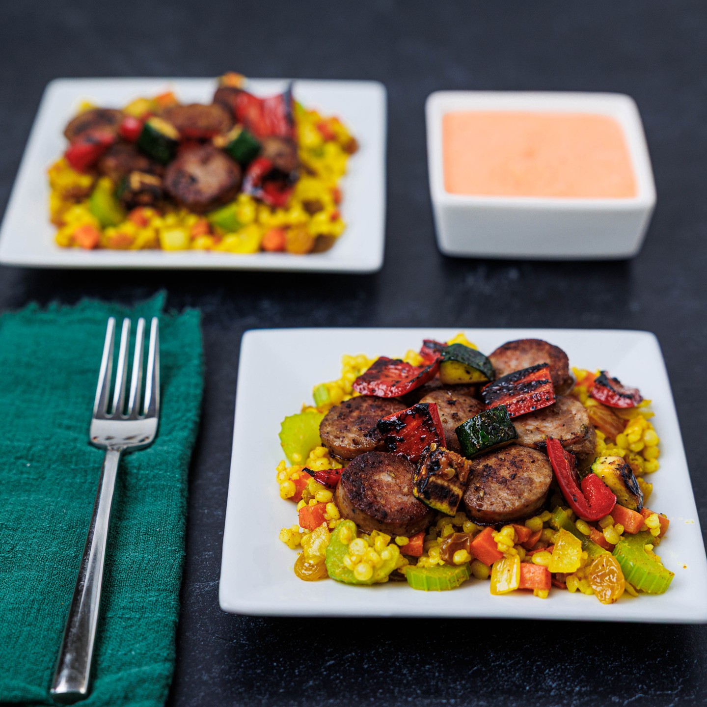 Warm Moroccan spices meet sweet and savory flavors in this satisfying couscous dish. Fluffy couscous is tossed with spiced vegetables and golden raisins, then topped with seared sausage and charred zucchini and peppers. A cool roasted red pepper yogurt drizzle brings everything together for a balanced, flavor-packed dinner ready in just 20 minutes.