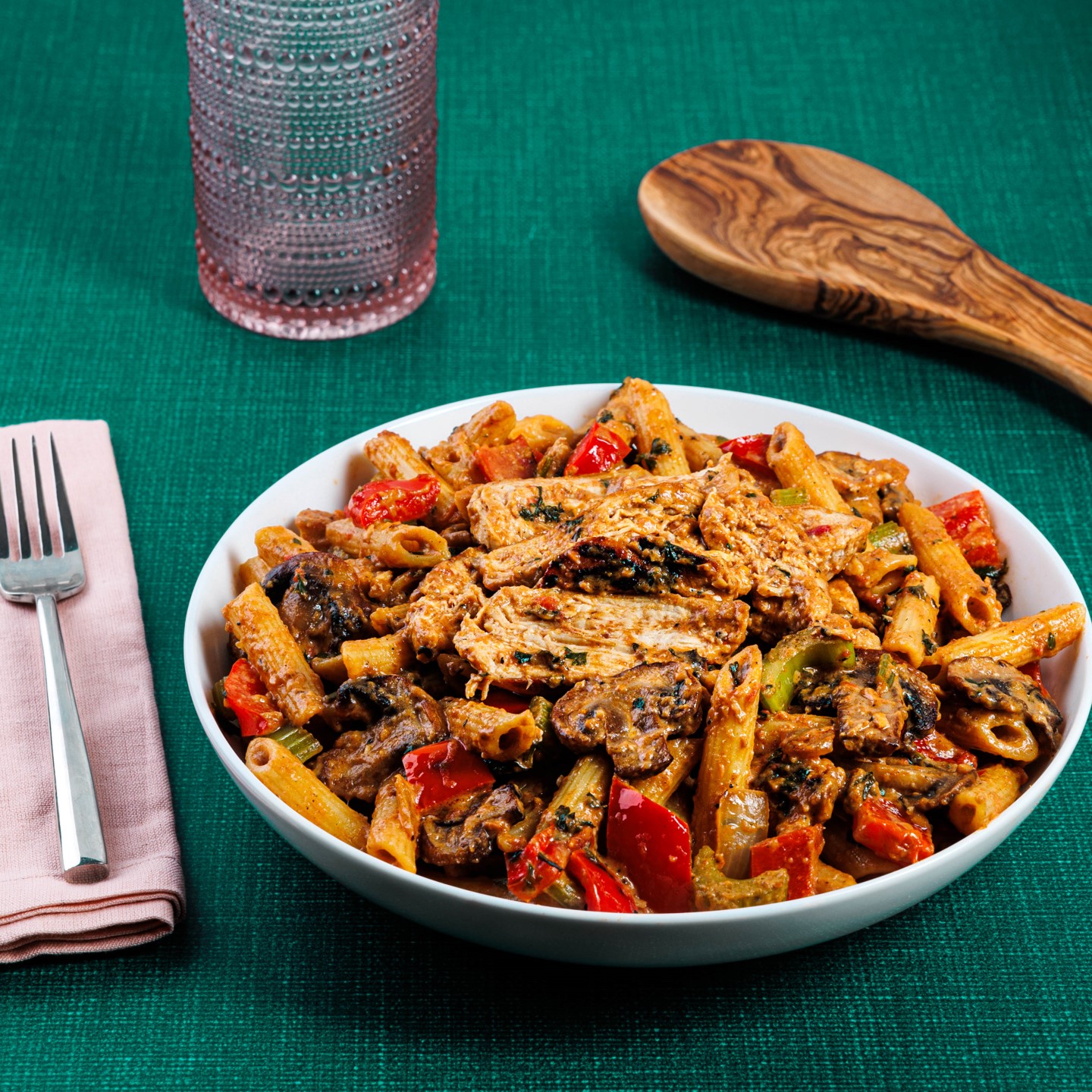 We just love this cozy New Orleans inspired dinner. We’ve created a mildly spicy Cajun tomato-cream-sauce, tossed with sauteed mushrooms, red bell peppers, chicken and penne pasta. It puts a little spice into pasta night.