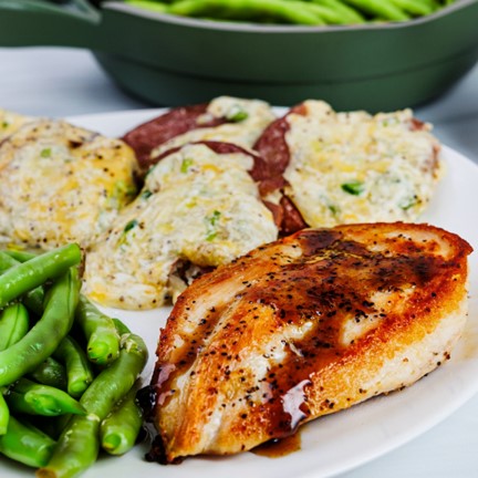 Think classic American dinner taken to the next level. With Cheesy Sour Cream Smashed Potatoes that are even more delicious than you can imagine, sautéed green beans and seared chicken breast glazed with a sweet and savory pomegranate basil sauce, it’s a family friendly dinner that’s on the table in just thirty minutes.