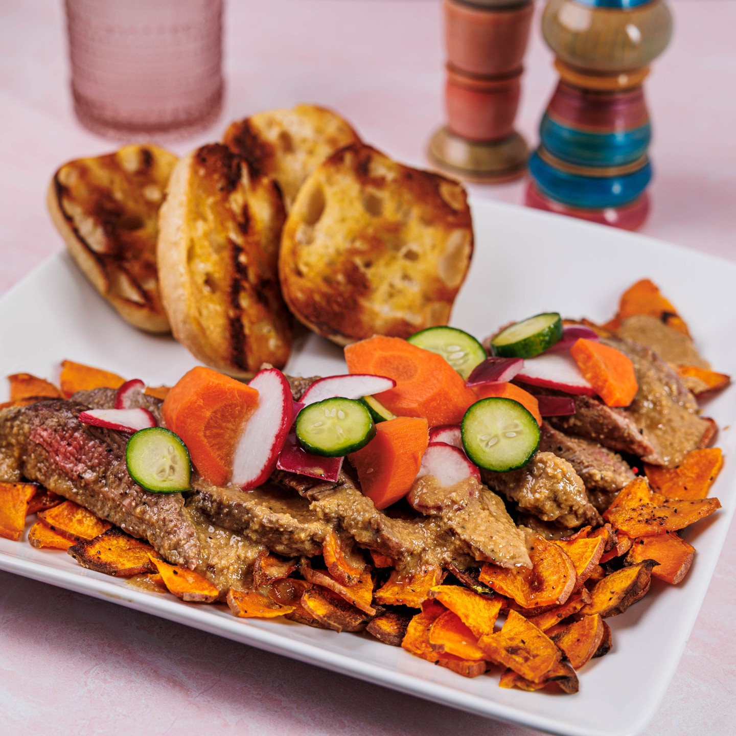 A classic Portuguese appetizer reimagined for dinner. Tender steak is simmered in a savory wine sauce, served over roasted sweet potatoes, and finished with tangy pickled vegetables. With warm dinner rolls on the side for soaking up every drop of sauce, this is comfort food, Lisbon-style.