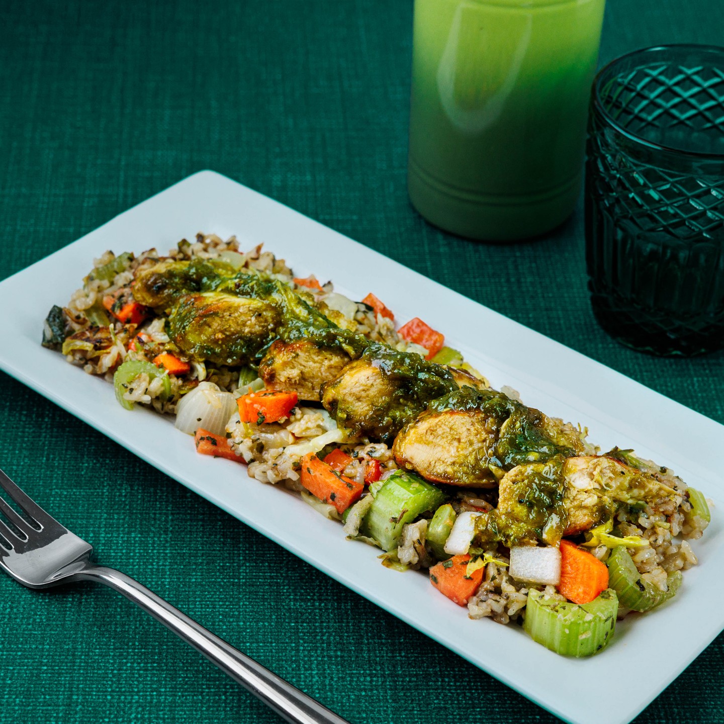 We’re serving garlic-yogurt-charred chicken breast with rice pilaf, Za'atar seasoned veggies, and golden raisins for a cozy Middle-Eastern dinner that’s herby, savory, and just plain delicious.