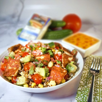 There’s nothing traditional about this test-kitchen favorite. We’re using a mango-chili sauce to give an Indian flair to this hearty seared halloumi and grain bowl. Finished with a fresh cucumber salsa, the result is a speedy dinner that’s totally unique. -- To add chicken, salmon, shrimp or steak, see “ADD-PROTEIN” section below entrees. --