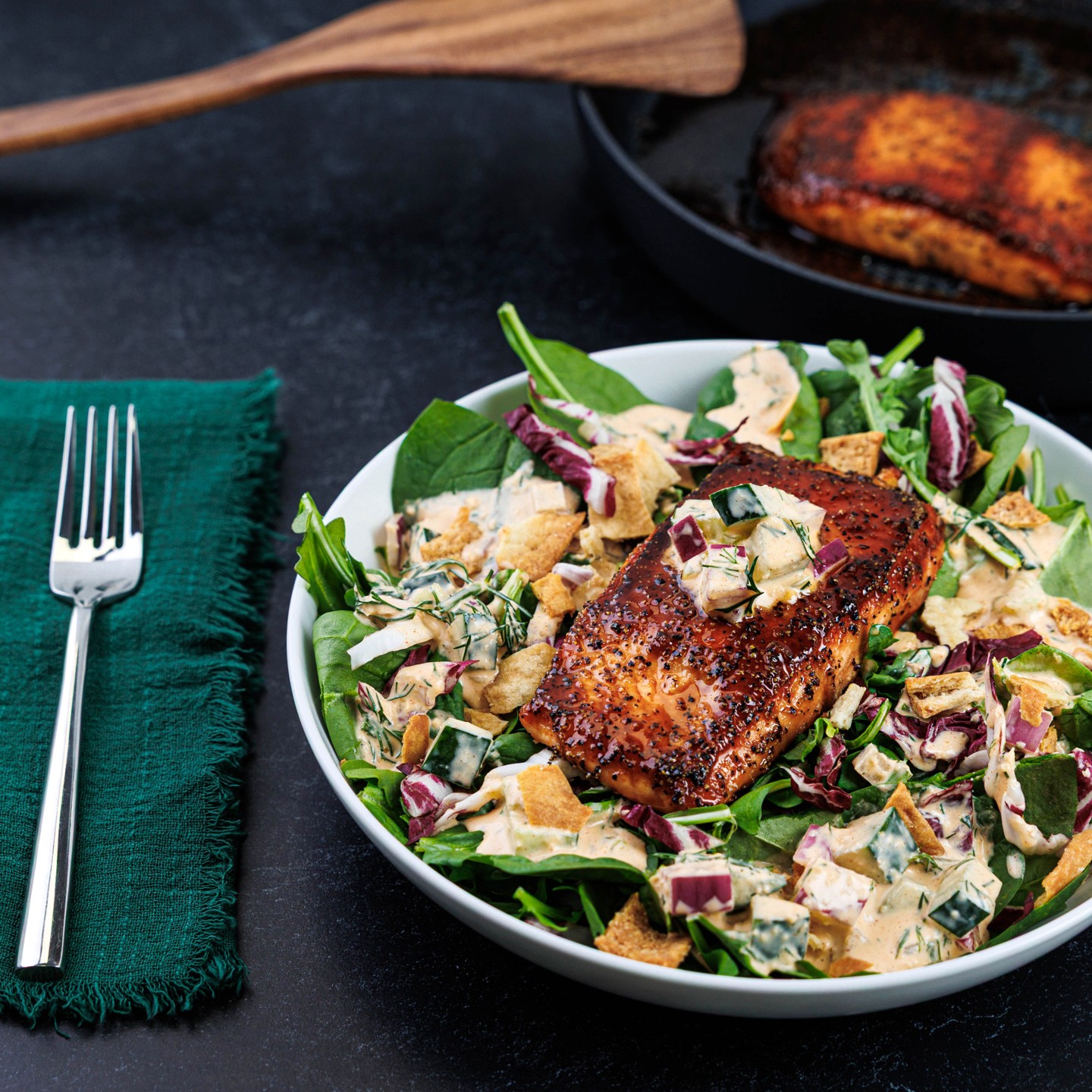 This salad combines the flavor of smoked salmon with the tender bite of a freshly seared filet. The trick is a smoky glaze that packs a flavor punch, plus crisp greens, crunchy pita chips and a cucumber dill dressing. It’s sophisticated and simple. Not to mention delicious.