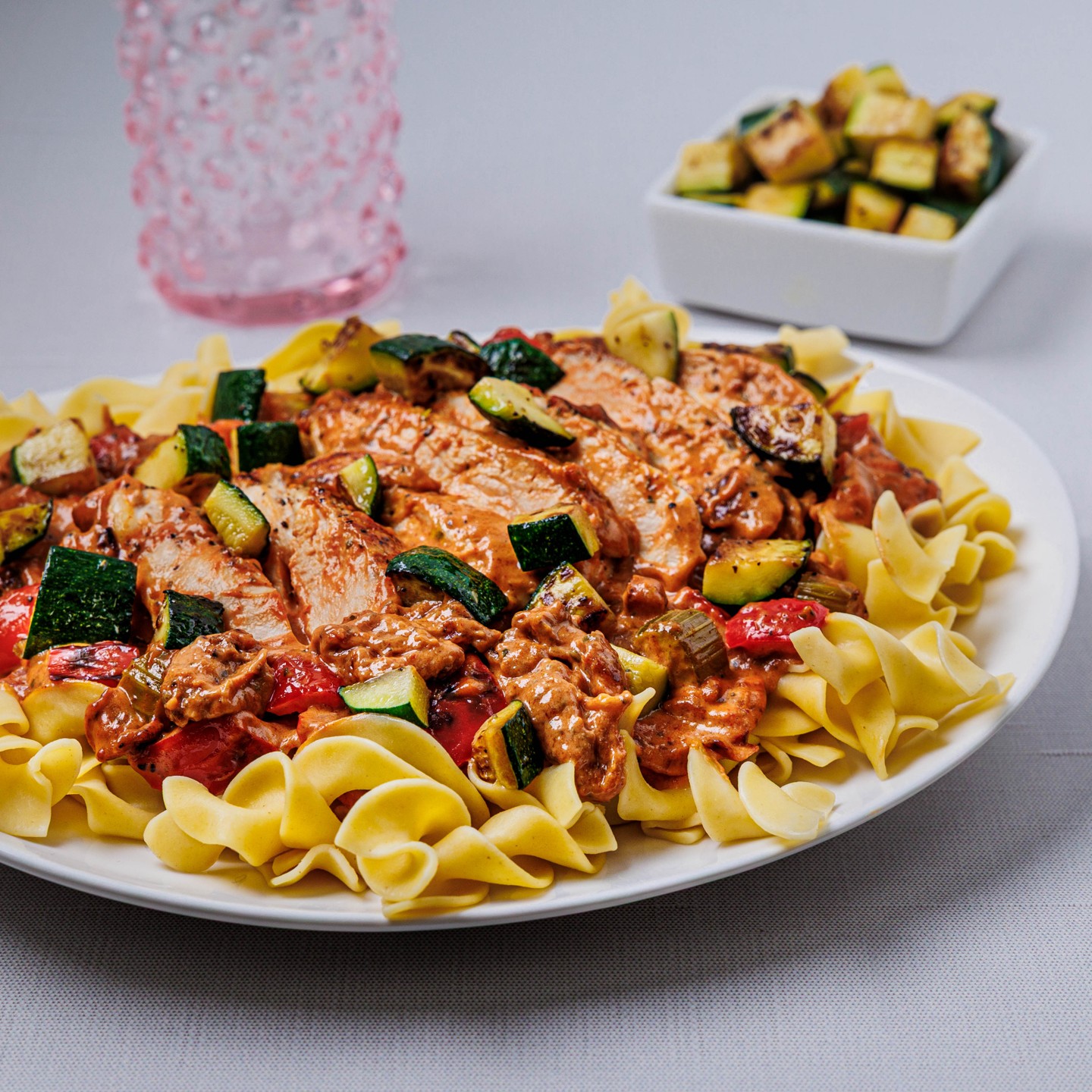 Inspired by the sunny flavors of Brazil, this creamy chicken dish is both comforting and vibrant. Juicy chicken, sweet potatoes, and peppers simmer together in a rich, tangy sauce with Dijon and a touch of spice, then get paired with tender noodles and seared zucchini. It’s bright, hearty, and full of flavor.