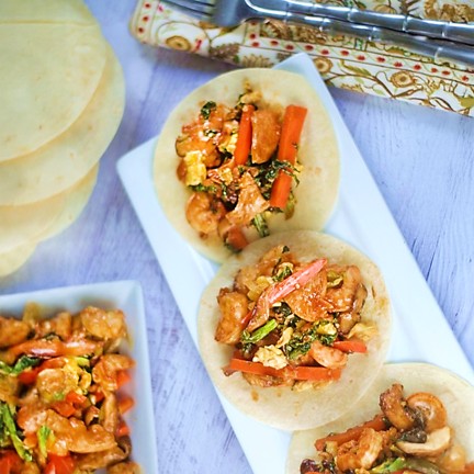 One of China’s most beloved recipes served up Meez style. We’re cooking chicken and shrimp in sweet, flavorful hoisin sauce, then tossing them with stir-fried Brussels, cabbage, carrots, kale and mushrooms. We’re putting it all inside a flour tortilla for a filling dinner that’s out of this world.