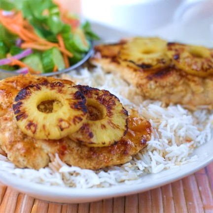 Classic tangy Hawaiian sauce over all-natural chicken breast with roasted pineapples & craveable pickled cucumber salad.