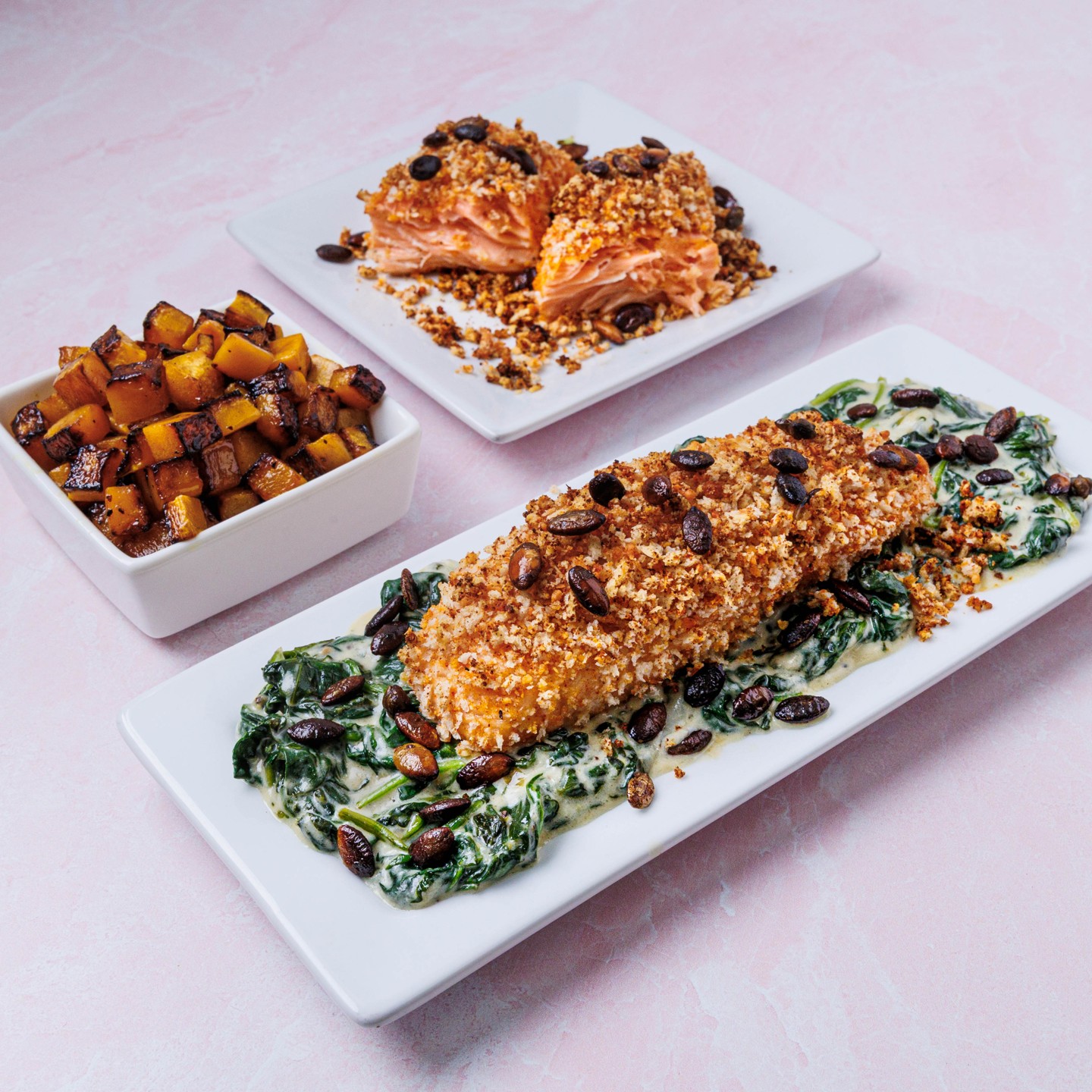 This dinner is all about texture and flavor. Golden, crispy salmon gets a garlicky parmesan crust. It's crunchy on the outside and tender inside. Served over cheesy spinach and sweet roasted butternut squash, then topped with toasted capers and pepitas, it’s rich, satisfying, and elegant.