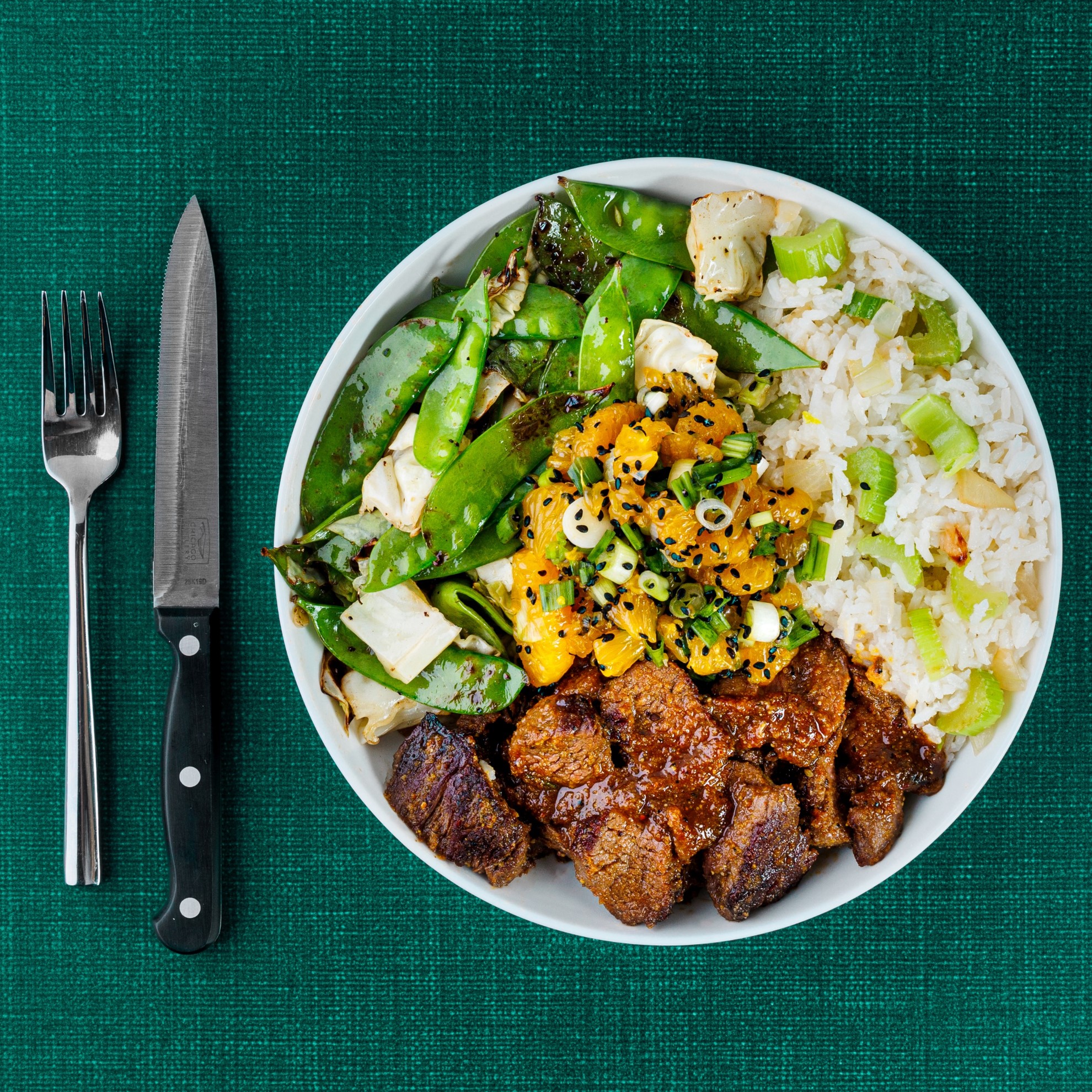 We are marinating our bistro chateau cut of steak with a thick and tangy orange sauce and then serving it over sautéed sugar snap peas, cabbage and veggie rice. Finished with mandarin oranges on top, it's even quicker, easier, and more delicious than the classic version.
