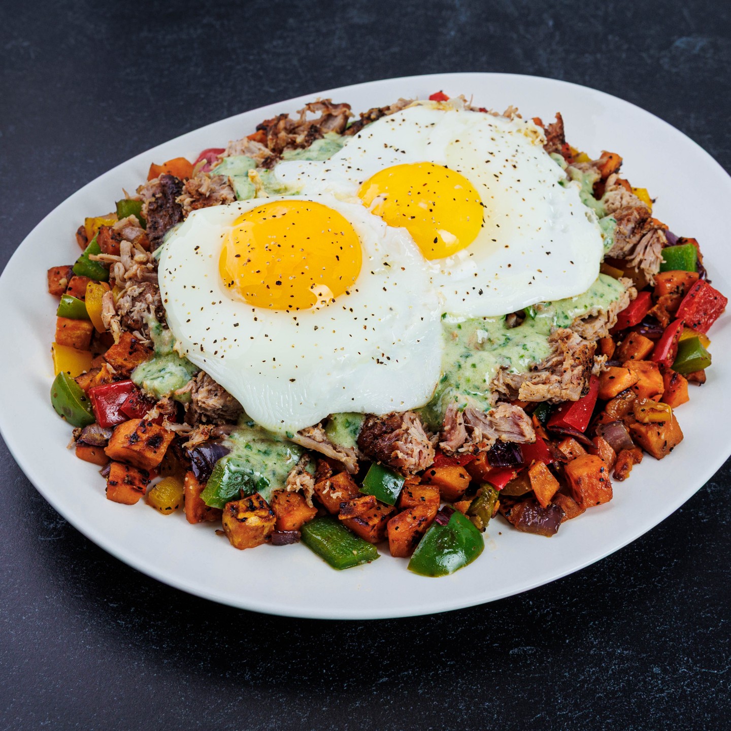Breakfast-for-dinner has never been more fun. It all starts with a pulled pork hash cooked up with plenty of vitamin-rich sweet potatoes, a medley of colorful peppers, and delicious Green Chile Crema. Topped with a fried egg, it’s comfort food you’ll just love.