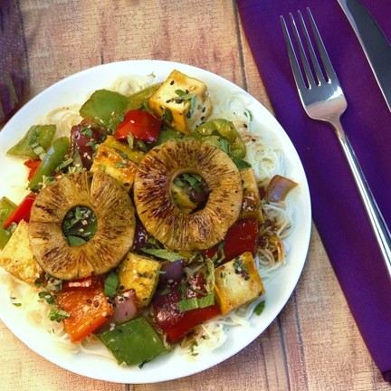 Sweet and Sour sauce might be the world’s favorite stir fry sauce. Soy, brown sugar, pineapple and spices come together to transform dinner. This week we’re cooking it up with seared peppers and onions, tofu and somen noodles, then serving it topped with caramelized pineapple. It’s a delicious dinner we can’t get enough of. -- To add chicken, steak, salmon, or shrimp, see "ADD PROTEIN” section below entrees. --