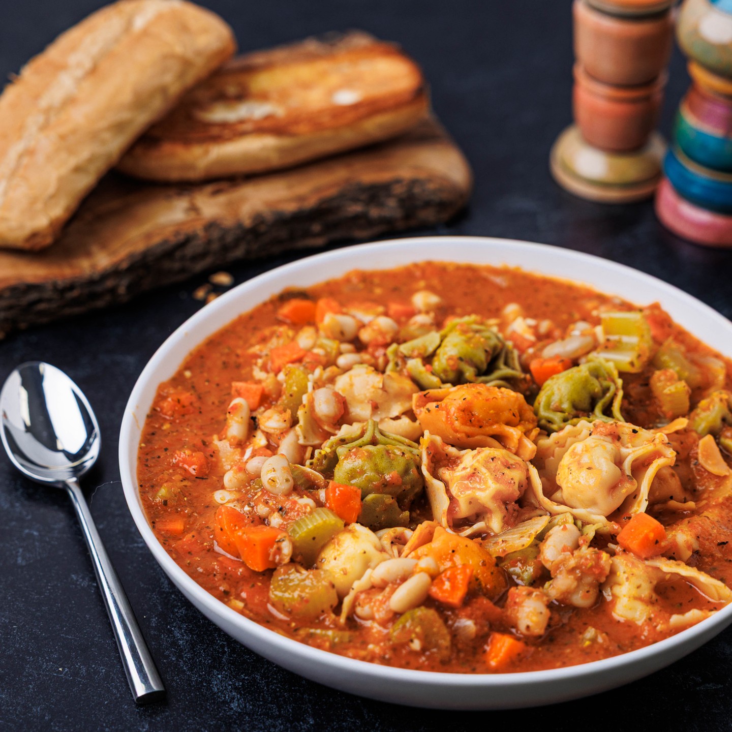 This hearty bowl lands somewhere between a cozy soup and an Italian chili. Cheese stuffed tortellini simmer with beans, vegetables, and a tomato-rich broth for a dish that’s filling without feeling heavy. Served with toasted dinner rolls for dipping, it’s warm, satisfying, and full of classic Italian flavor. -- To add chicken or steak, see "ADD PROTEIN” section below entrees. --