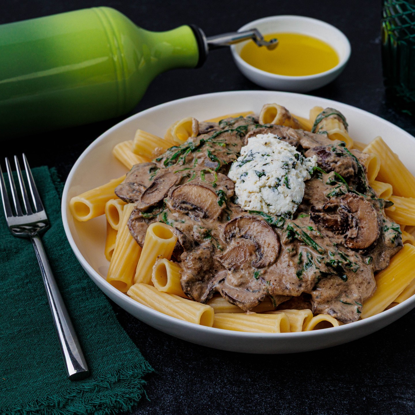 This speed meal is a mushroom-lovers dream. We’re using a flavorful Parmesan and basil goat cheese, sautéed cremini mushrooms and splash of cream to add an indulgent richness that we just love. Tossed with arugula and rigatoni, it’s simple and sophisticate and on the table in a flash. -- To add chicken or steak, see "ADD PROTEIN” section below entrees. --