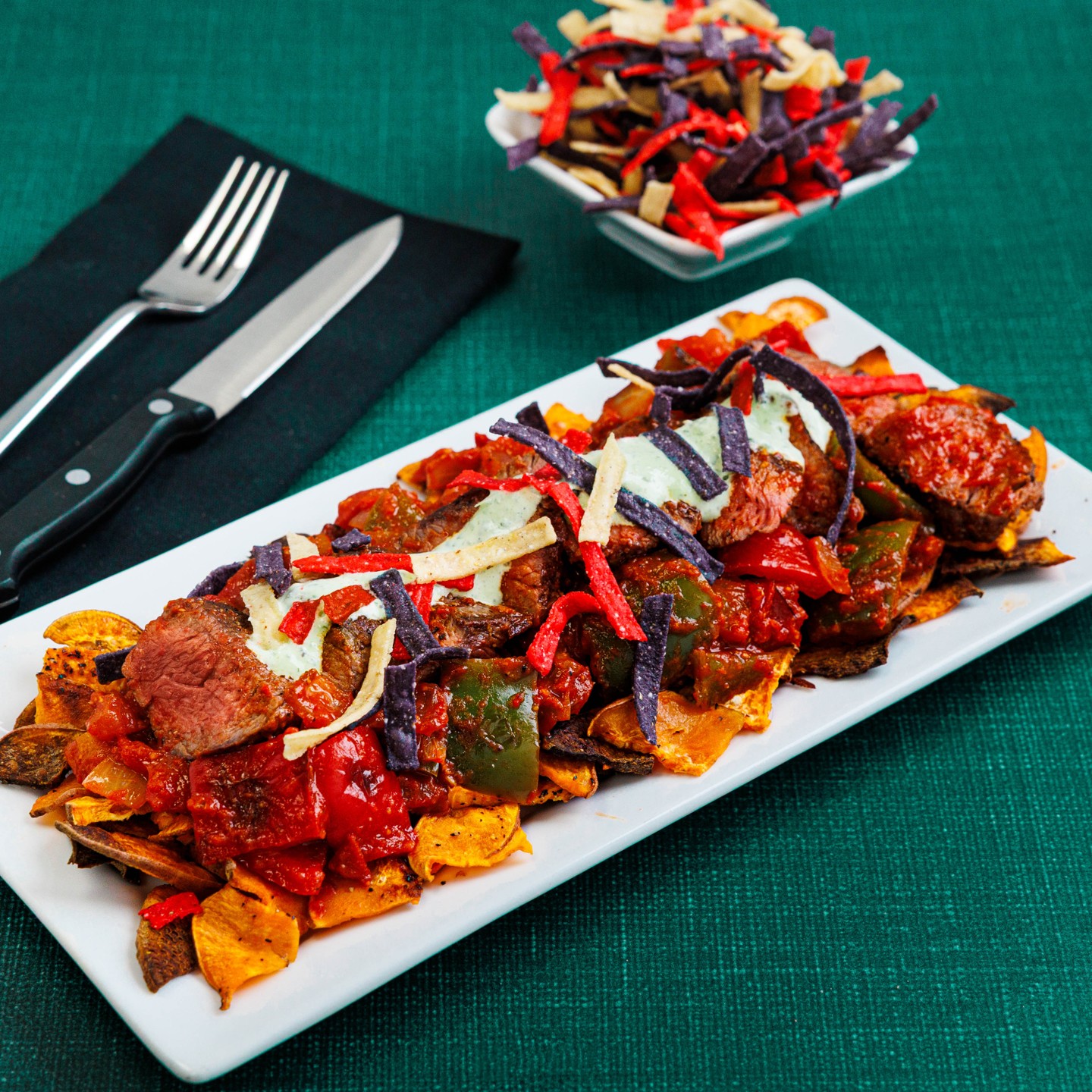 Juicy sliced steak is tossed in a smoky tomato ranchero sauce with charred peppers and onions, then served over roasted sweet potatoes. Tortilla strips add a crisp finish, while cool cilantro crema brings it all together for a balanced, crave-worthy meal.