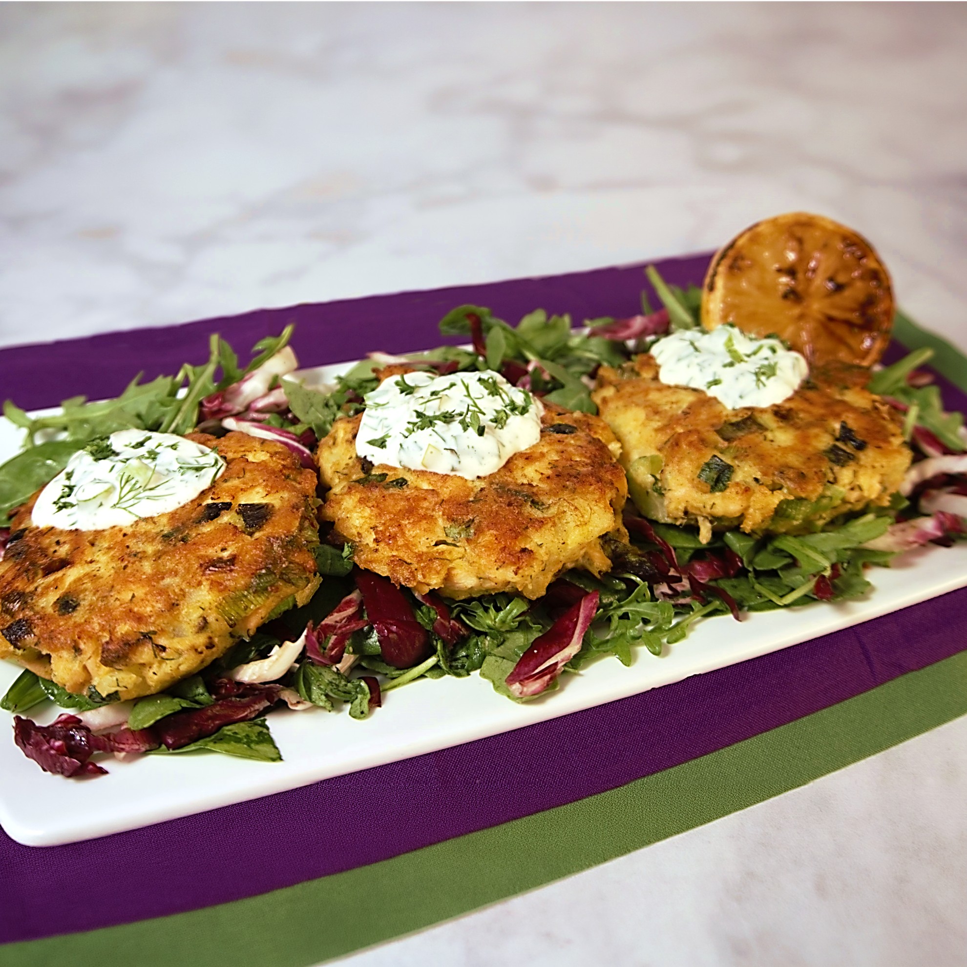 Get ready for fine dining at home. We’re mixing up tender salmon with mashed potatoes and sautéed veggies for a sophisticated cake worthy of your favorite white-tablecloth restaurant. Served over fresh greens with a rich Dill Crema sauce, it’s an elegant dinner we can’t get enough of.