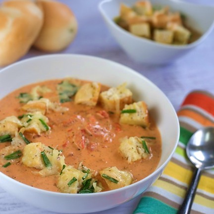 Cream of Tomato Soup with Grilled Cheese Croutons (Veg) OR ADD Chicken, Salmon or Steak