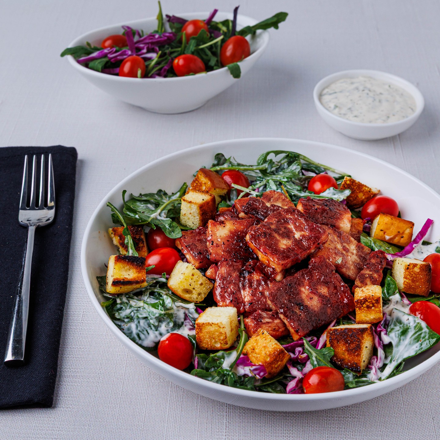 This salad is all about bold contrast and big flavor. Golden-seared halloumi is coated in a sticky honey glaze that plays perfectly against its signature salty bite, then layered over crisp greens with juicy tomatoes and warm, crispy croutons. Tossed in a bright lemon pepper dressing, it’s satisfying, unexpected, and ready in just 15 minutes. -- To add chicken, steak, or salmon, see "ADD PROTEIN” section below entrees. --